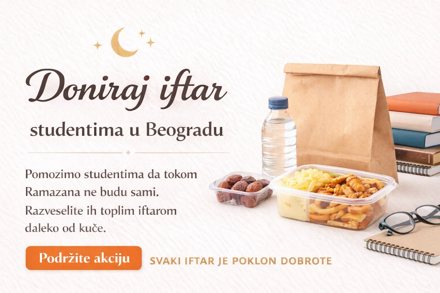 Zato Svetionik i ove godine organizuje akciju „Iftarimo zajedno“ i obezbjeđuje besplatne iftare za studente koji poste i studiraju u Beogradu. Tvoja donacija direktno pretvara ovu namjeru u obrok na stolu.